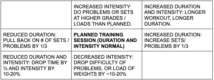 The first is fatigue. I'm not talking about the tiredness you feel from not getting enough sleep, but rather that "stuck in molasses" feeling of sluggishness you get when you're still recovering from the last session. If you are fatigued, you should reduce the duration of the session, moving to the left on the chart above. This is normally a ⅓ reduction, and I prefer to take this off all sets/problems planned rather than just cutting a section of the session altogether.